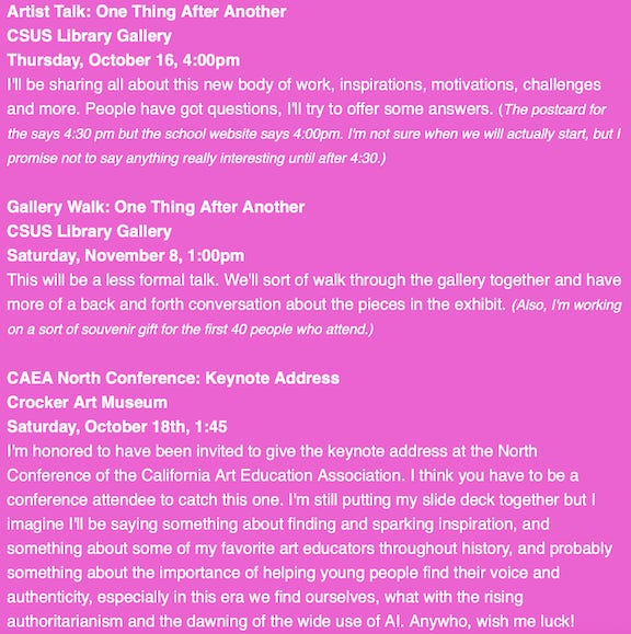 I can’t say, but maybe she can. Gioia’s show is on display through Dec. 6, 2025, but she’s giving talks, walks, and addresses before the show succumbs to all the Weariness and Concern, or the end of the academic semester. If you are in or going to be in Sacramento on October 16 and November 1, ask Gioia her views and give her some of your own.