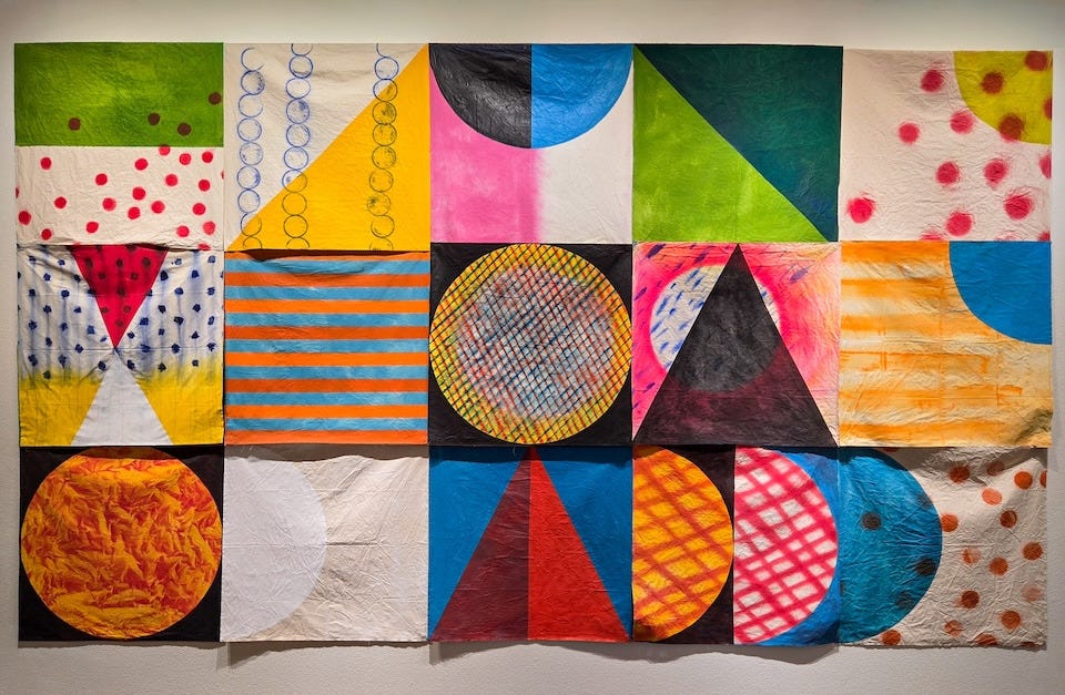 I love Gioia’s work. I might be biased, but she’s always had a passion for and command of color that speaks to my cold, black, and unfeeling core. She’s able to wrangle many otherwise conflicting or ill-matching colors and patterns into a cohesive and complementary work (or outfit!). Pieces she made a few years back used cheery hues and pleasing shapes and designs to make hard subjects palatable – playful strings of many colors and sizes woven together to create a vibrant and happy representation of the myriad of worries occupying brain space. Or, beautiful shapes of varying tints and shades masking the distress lying beneath a calm-presenting surface.